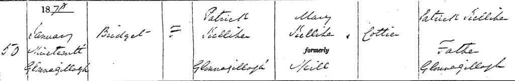 Bridget Delia Kelliher was born on 19 Jan 1872 in Glounagillagh, a farming area about 7km from Killorglin, Co Kerry (although their farm was at Muingaphuca, one or two kilometers away). Her parents were Patrick Kelliher & Mary [O’]Neill.