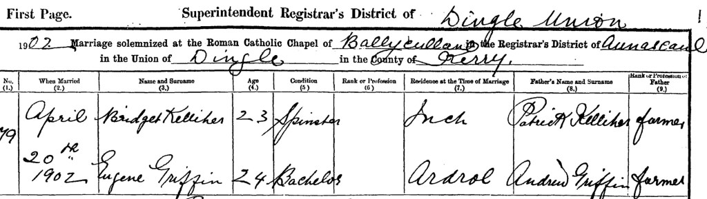 Bridget married Eugene Owen Griffin, a farmer at Annascaul on the Dingle Peninsula, on 20 Apr 1902: