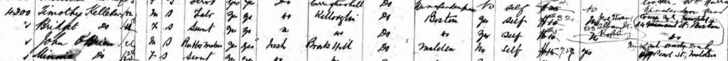 When Patrick Kelliher died in 1895 Bridget was just 17 and an orphan, as her mother Mary had passed away before her father. On 24 Apr 1896 she sailed on the S.S. Pavonia to Boston with a Timothy Kelliher (aged 22). Timothy was her first cousin: Patrick had a brother Timothy Kelliher who inherited Patrick’s holding on his death, and Timothy had a son [John] Timothy, born in 1874. Their destination on embarking was (it appears, the writing is not very clear) a cousin named Murphy (click the following to view a larger image):
